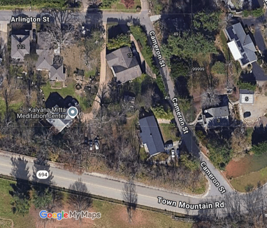 The location of Kalyāṇa-Mitta Meditation Center is 122 Arlington Street, Unit B, Asheville, NC 28801.  It is upstairs in a beige colored house.  Drive down to the end of the driveway adjacent to 114 Arlington St., the house is behind 114 Arlington St.  There is a wooden sign in front of the entrance at Unit B.